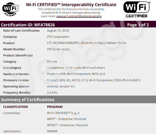 Zte Blade A0722 Clears Wi Fi Alliance And 3c Certification