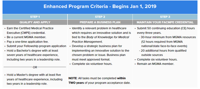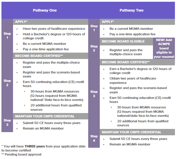 Medical group management association mgma all rights reserved. For more than 60 years the american college of medical practice executives acmpe has been elevating exceptional medical practice managers to the role of certified medical practice executive cmpe and fellow facmpe.