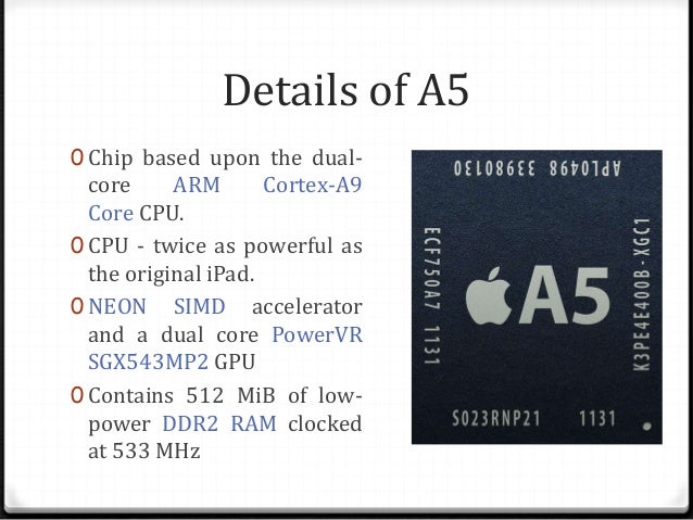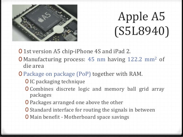 It is manufactured in a package on package pop together with 512 mb of dual channel lp ddr2 dram. Reportedly based on arms cortex a9 central processing unit with imaginations powervr sgx 543mp2 graphics processing unit apple will only say it provides 2x the computing power and 7x the graphics power of iphone 4. Apple a5 s5l8940 apple uses the first version of the a5 chip in the iphone 4s and ipad 2. Apple a5 uses package on package technology which is an integrated circuit packaging technique that combines discrete logic and memory ball grid array packages.