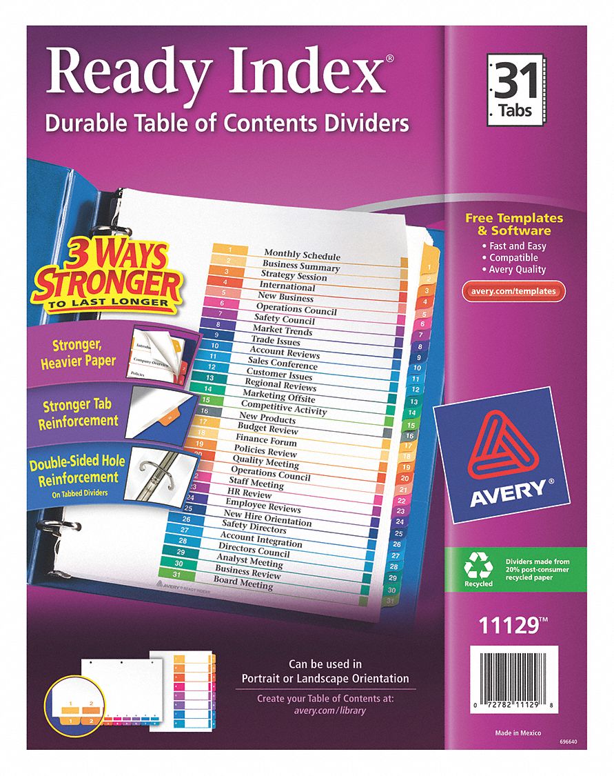 Get the quality you expect from avery the worlds largest supplier of labels. Avery ready index table of contents 1 31 11129 template. 2 in 1 tab design lets you pick between portrait and landscape formats. Thousands of free pre designed templates.
