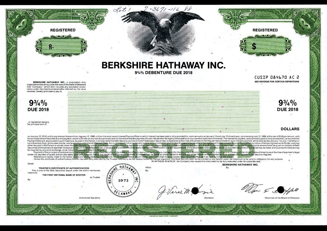 Berkshire Hathaway Inc Specimen 1988 Registered Bond With Facsimile Signature Of Warren Buffet