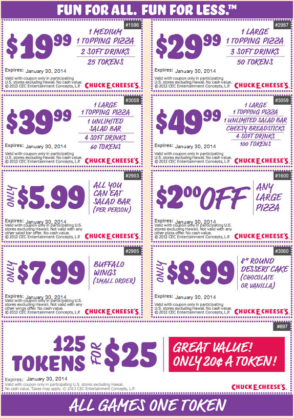 Parents can get discounts on birthday specials pizza salad bar appetizers drinks and even free tokens with the latest printable coupons. Cheese promo codes to save money on a family day out or a birthday party your child will love. Chuck es weekly deals more details. When everyone is hungry pile into a booth to feast on pizza wings fries and desserts.