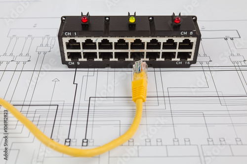 Network Switch And Utp Ethernet Cable On The Blueprint Of