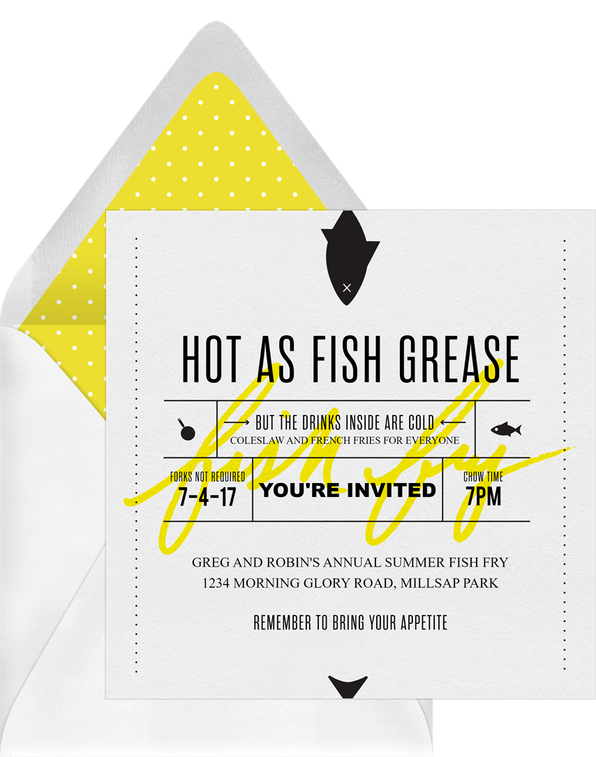 Choose from over a million free vectors clipart graphics vector art images design templates and illustrations created by artists worldwide. E invite invitation birthday baby shower invitations invitation ideas fish fry party fry baby fried fish housewarming party fundraising events. This means that you fold an 8 12 sheet of paper in half and fold again to create a single invitation. Please read listing very carefully and test the demo to ensure this will meet your partys needs.
