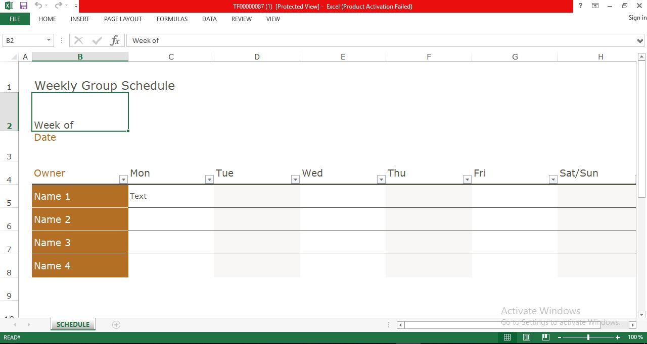 This is an accessible template. Group schedule templates for excel keeping your own schedule can be hard enough and this is exponentially harder when you are tasked with keeping track of a group of people. Plan the weekly schedule for your groups events or projects with this lively green template. Group schedule template if youre going to have a couple of team members who will be helping you out with a certain project or task that might require days to do then that would mean that all of you will have to come up with a proper schedule that will outline what needs to be done and when.