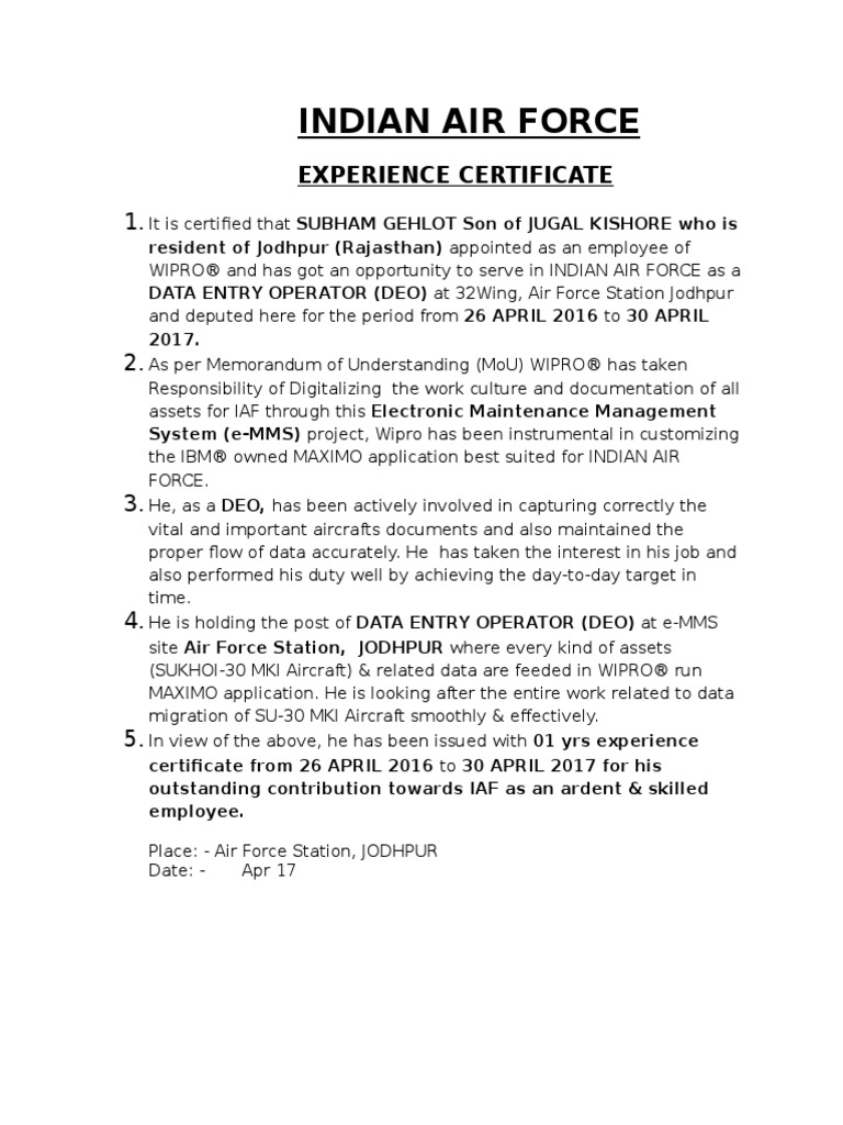 Indian Air Force Certificate