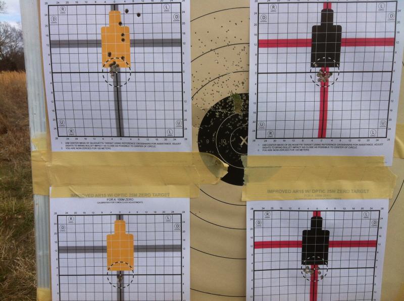 The targets are great sighting in rifles at 100 yards and general target practice. Adjust sights to move shot group center as close as possible to the white dot in the center of the target. M4 carbine 25m zero. Magnified silhouette from the zero target above with rings calibrated to nothing in particular.