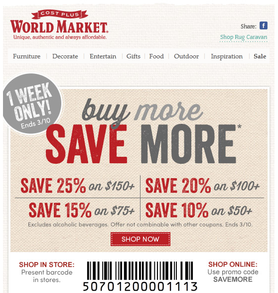 Next look through the ways to save on the website for information about cost plus world market rewards the cost plus world market credit card and more. In this digital circular you. The world market chain sells furniture home decor items and grocery items and customers particularly like the special offers that include discount deals and coupon codes offering. Todays top deal.