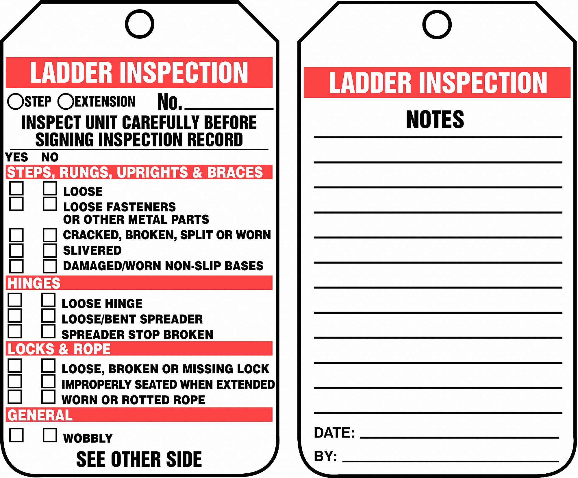 Fiberglass aluminum wood fiberglass aluminum steps. Use daily ladder inspection tags for work site safety may 4 2016 by kevin kelley 1 comment the use of ladder tags provides documentation to show that the ladders used on the job site have been inspected and have been determined to be safe for workers. How can we improve. Ladder inspection tags can be easily hung from a ladder and clearly indicate if it is ready for use.