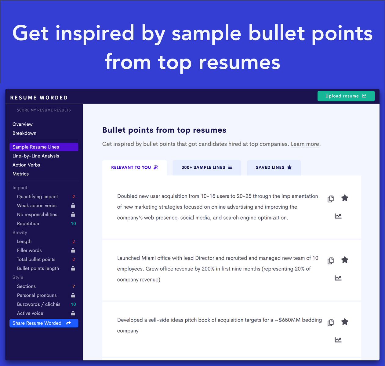 Whether you are a job seeker recruiter or a student well give you tons of summary examples that you can use. Not sure what to include in your linkedin summary. Resume line suggestions the first iteration of resume worded was all about giving you real sample resume lines used by top candidates that you can use as inspiration. With our resume tools youll then be able to ensure you are maximizing the conversion of those jobs to interviews.