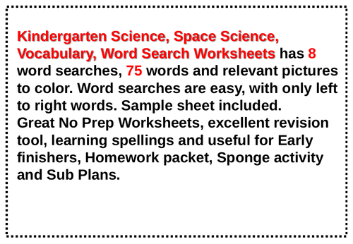 Kindergarten Science Space Science Vocabulary Word Search Worksheets