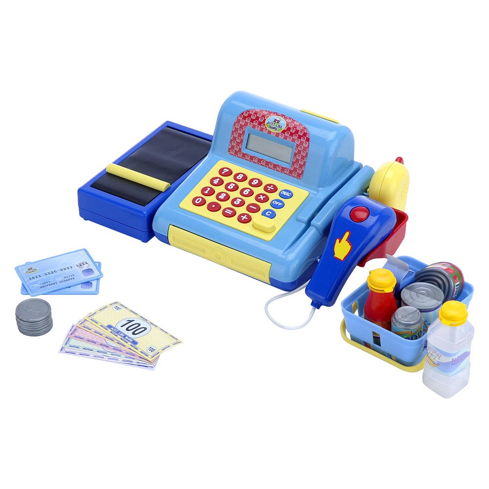 Boley toy cash register with scanner red and blue toddler cash register toy for kids with real calculator play money credit card reader 39 out of 5 stars 28. It doesnt make any sound or require any batteries. Toy cash registers have been popular with children for generations. If you dont want to pay with cash you can use your play atm card.