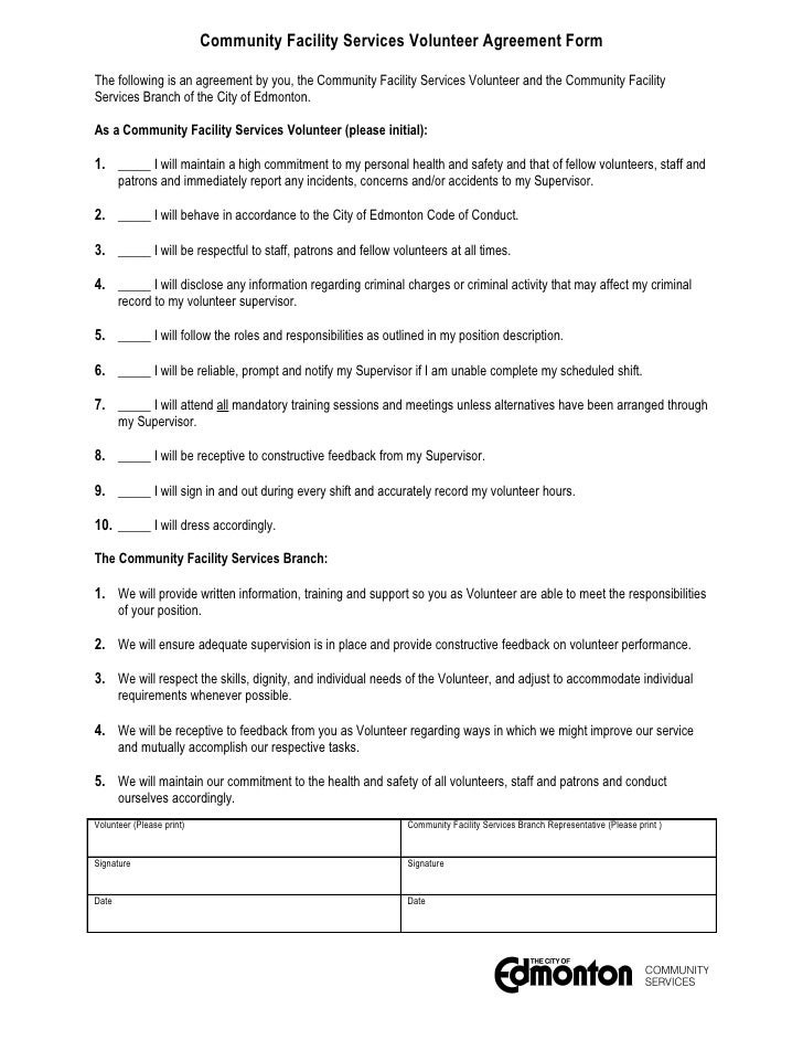 Volunteer service agreement template. Volunteer agreements can be used to set out both an organisations commitment to its volunteers and what it hopes for from its volunteers. Volunteer service agreement natural and cultural resources. A volunteer agreement clarifies the expectations of both parties in relation to length of time commitment confidentiality attendance at training and adherence to the organisations policies and procedures. The gsa forms library contains these forms and views.