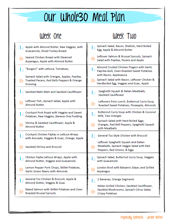Whole30 meal plan you can download a free copy of the full whole30 meal plan here. Plus 1 week of whole30 dinners lunches and breakfasts with a grocery list. It is organized by both day and meal. A printable version of the whole30 program rules the meal planning template and 15 recipes from melissas cookbooks.